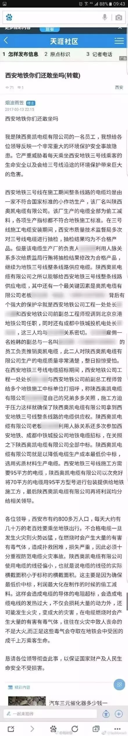 事件回顾 3月15日,有网友发帖质疑地铁三号线电缆相关问题