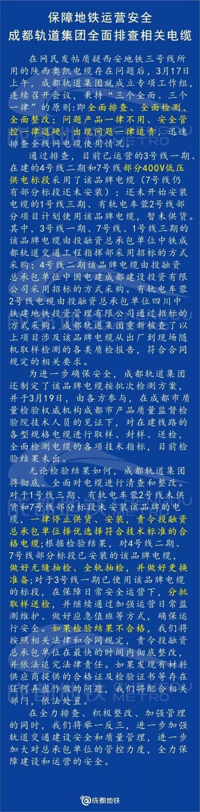 其中,成都地铁4号线二期和7号线是计划今年内开通试运营的线路。目前,成都轨道集团已责令投融资总承包单位立即停止了对在建项目该品牌电缆的供货和安装,对部分标段该品牌电缆送检,若检测结果不合格,将重新择优选择符合技术标准的合格电缆,并在最快时间内对已安装的不合格电缆进行更换。 对于成都地铁3号线一期已使用奥凯品牌电缆的标段,在确保线路日常安全运营的前提下,成都轨道集团将利用夜间停运时间,以使用备用电缆方式,对现有电缆进行分批取样、封样、送检。若电缆抽检结果不合格,将立刻组织在夜间停运时更换,并通过加强运营日常监测维护、做好应急值班等方式,确保运营安全。 |